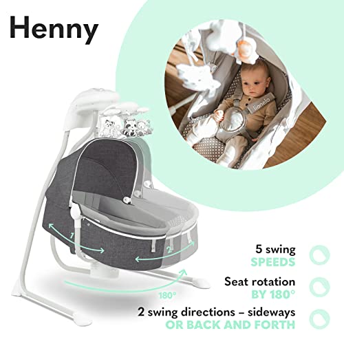 LIONELO Henny 3in1 Baby Wippe, Babyschaukel und Babyliegestuhl, Babywippe Elektrisch mit Liegefunktion, 10 Melodien, Karussell, USB-Anschluss, Moskitonetz (Dunkelgrau)