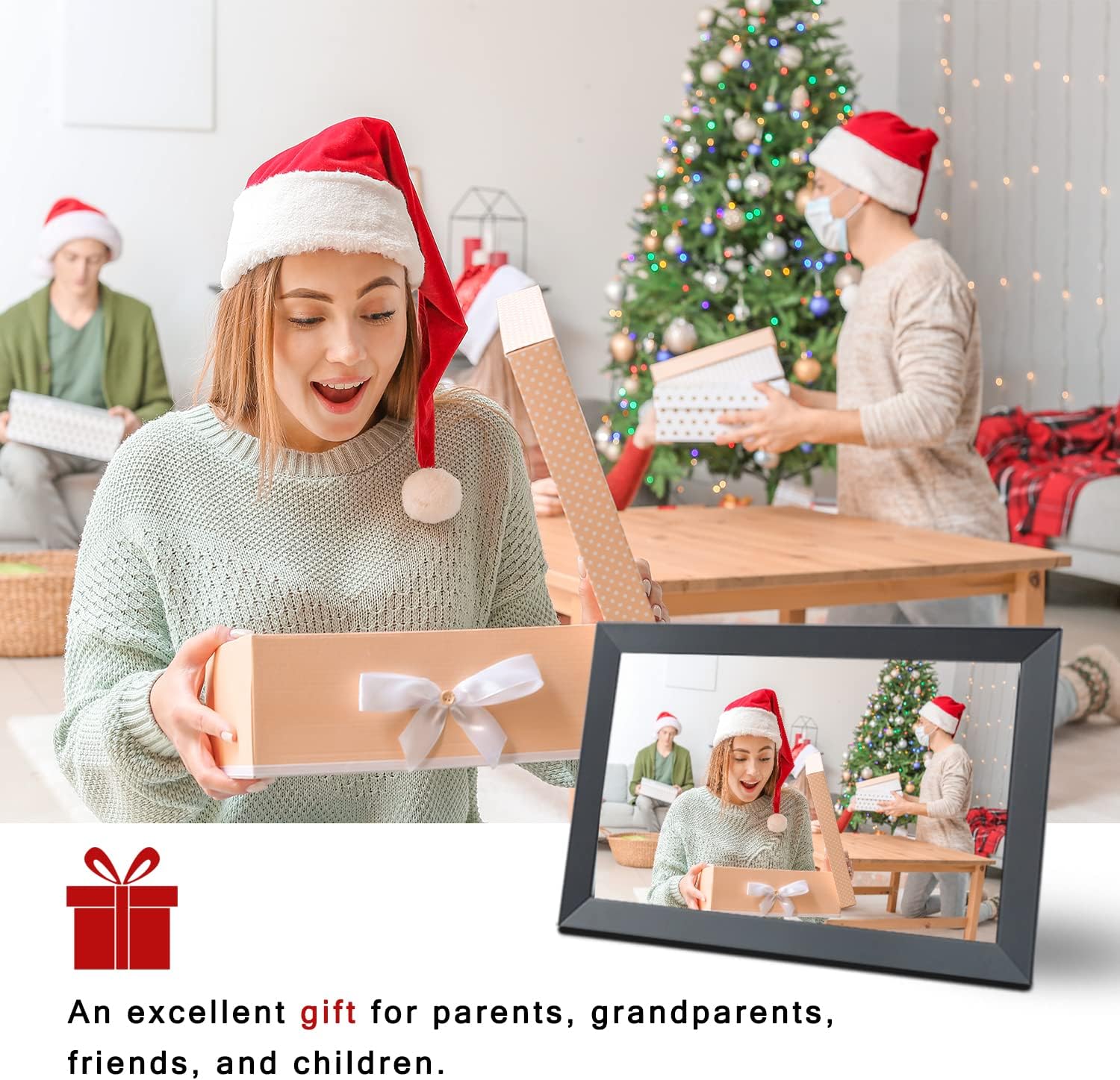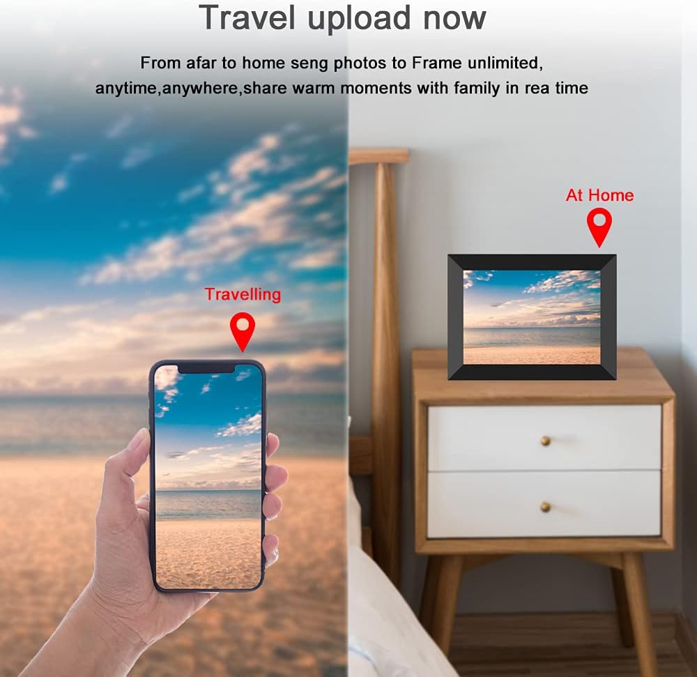 【Teilen Sie Ihre glücklichen Momente sofort.】 Senden Sie Fotos direkt von überall auf der Welt an den intelligenten Fotorahmen. Freunde und Familie können Ihre wunderbaren Momente auf dem digitalen Fotorahmen in Sekunden lang genießen. Perfekt zum Dekorieren Ihres Hauses oder des Schreibtischs und ein süßes Geschenk für Freunde oder Familie.