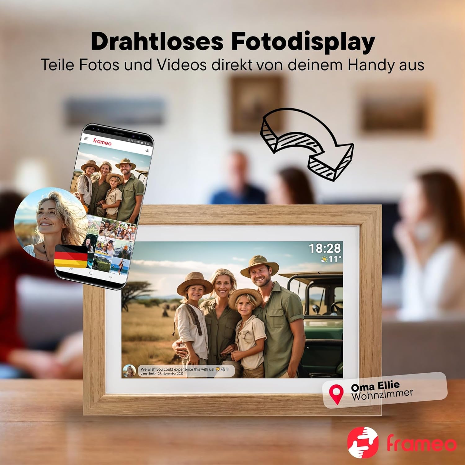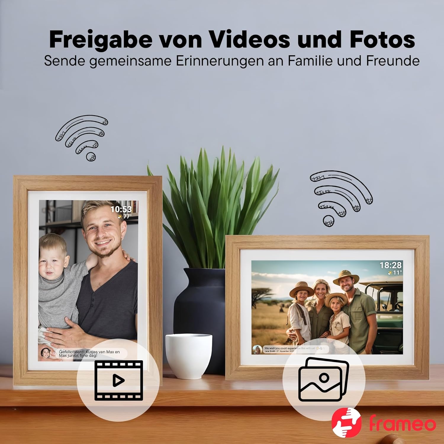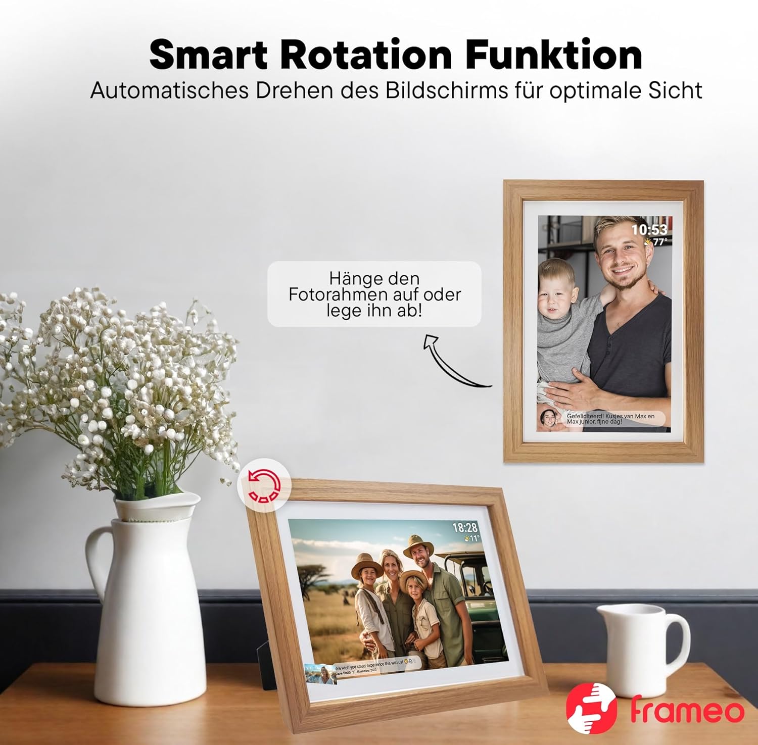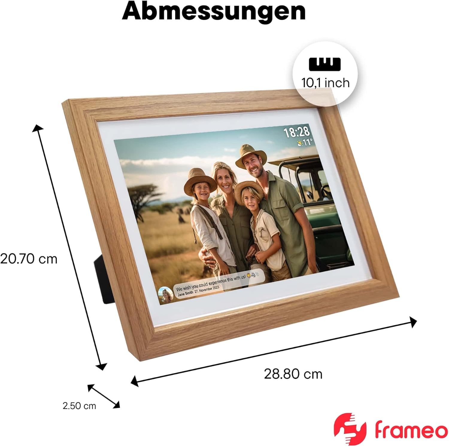 Ein stilvoller 10,1 -Zoll -digitaler Bilderrahmen mit einem Holzlook – perfekt für jeden Innenraum. Ein klassischer Look mit einer modernen Note!