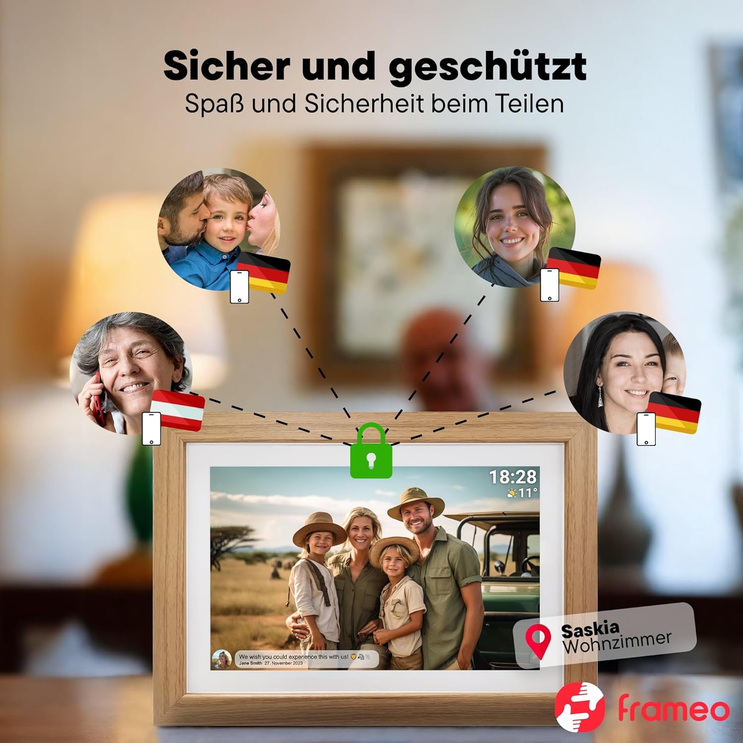 16 GB Speicher – viel Speicher mit 16 GB Speicherplatz, um alle Ihre Erinnerungen sicher zu halten. Foto- und Videodateien werden sicher und sicher im Frameo -Fotorahmen gespeichert.