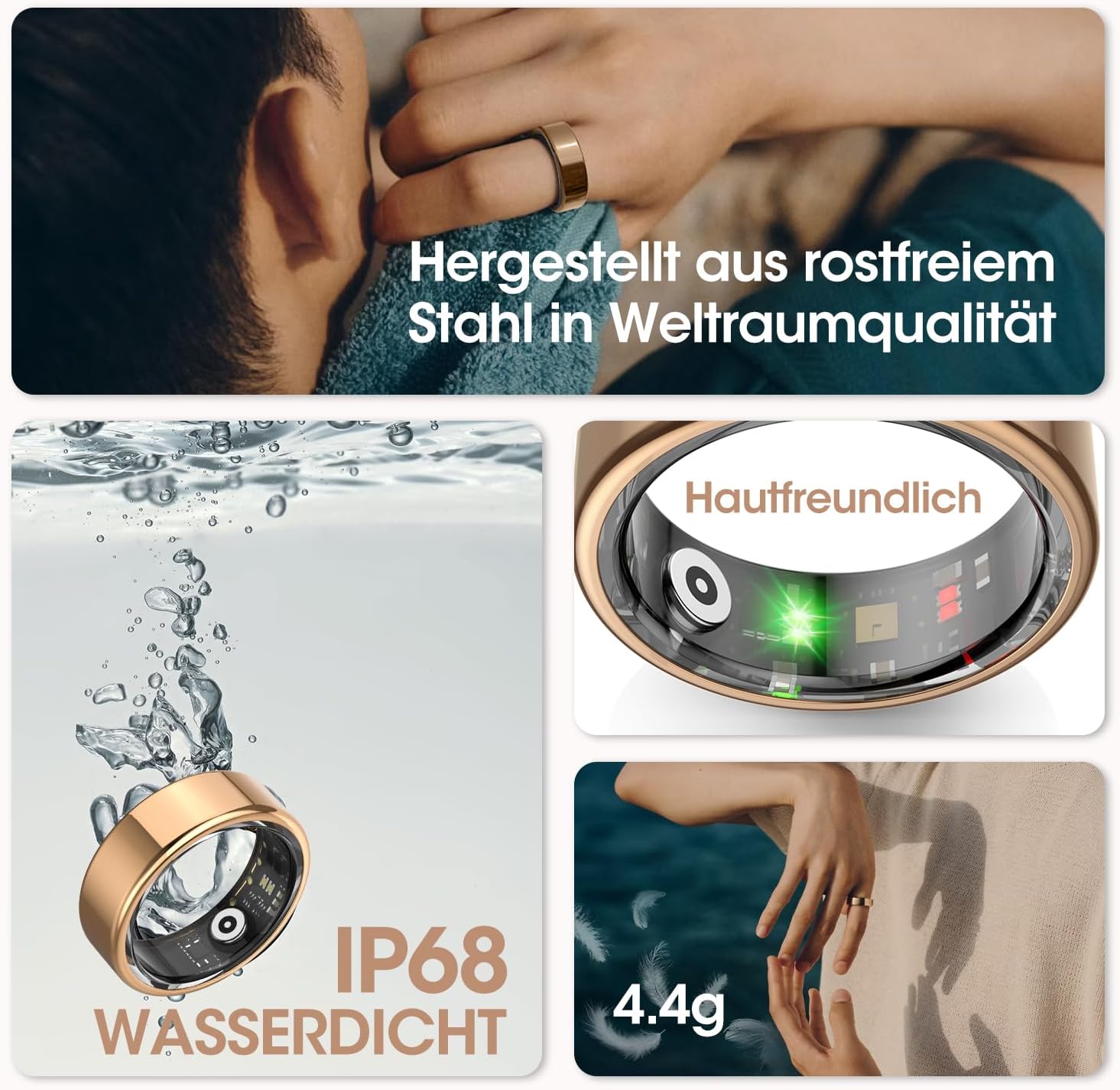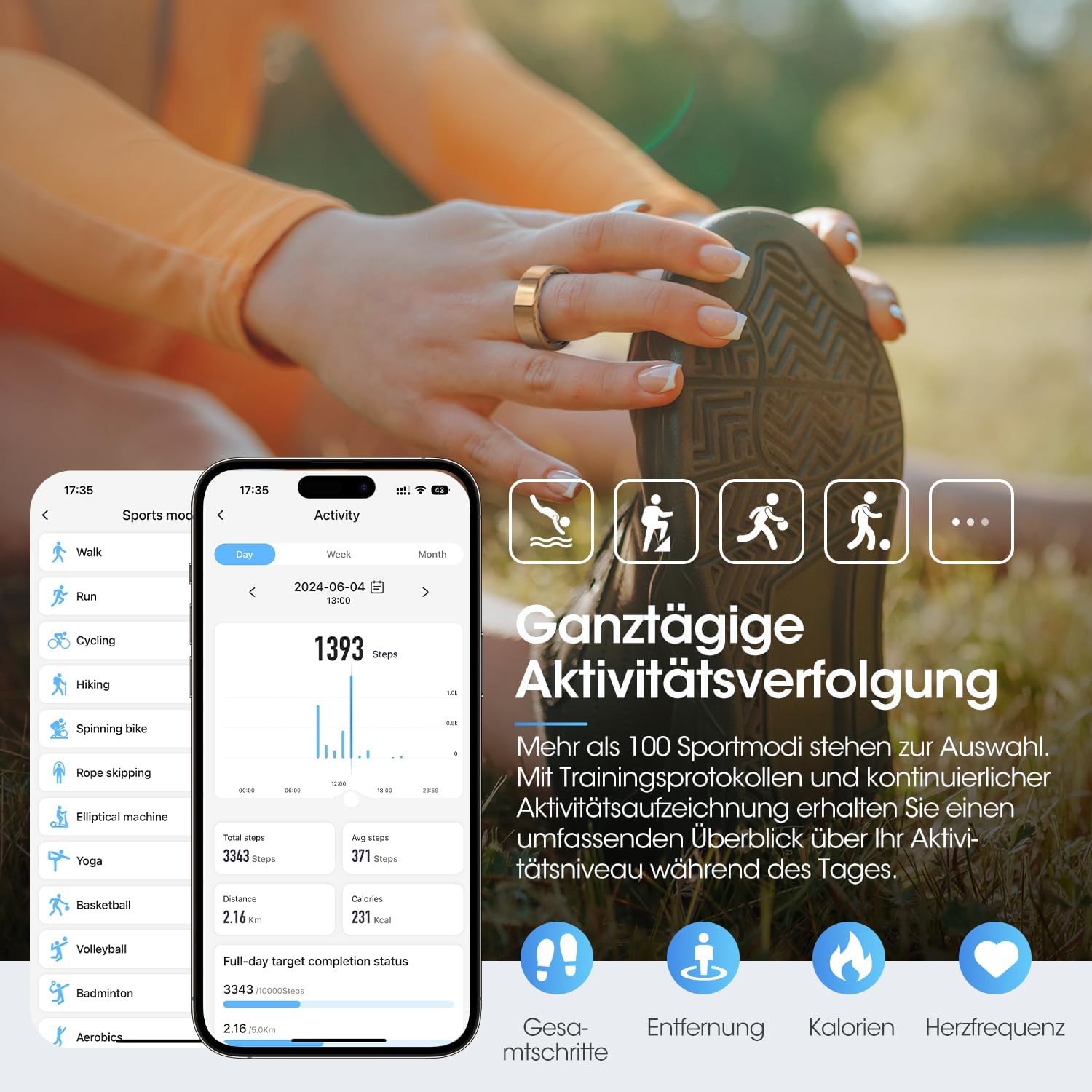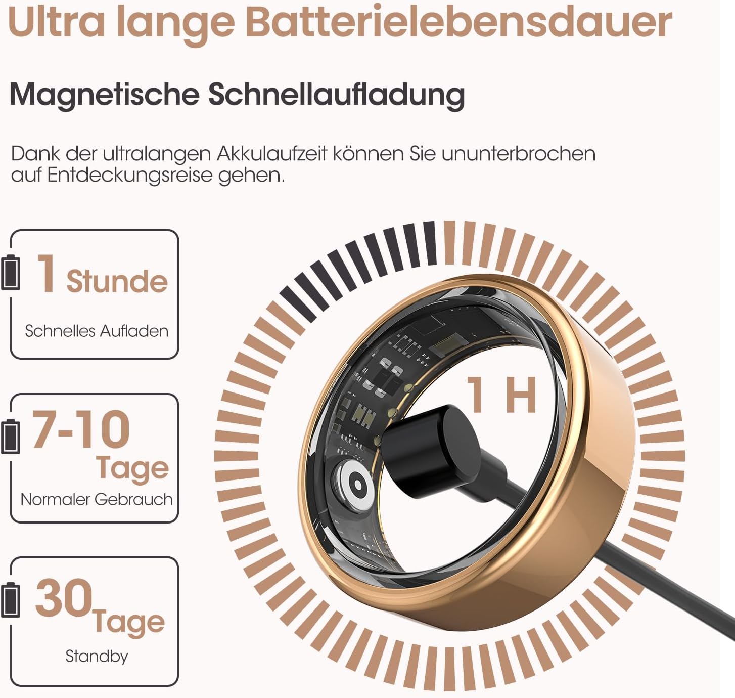 Leichtes Design, kaum wahrnehmbar: Dieser intelligente Ring besteht aus leichtem Material, das ein komfortables und kaum wahrnehmbares Tragenerlebnis gewährleistet. Sein schlankes Design ist nicht nur elegant, sondern auch ideal für den ganztägigen Gebrauch, sei es im Alltag, in der Arbeit oder im Sport. Das leichte Gewicht verursacht keine Belastung, sodass Sie seine Anwesenheit kaum bemerken, während es Ihre täglichen Aktivitäten nicht beeinflusst und stellt sicher, dass Sie immer in Ihrer besten Form sind.