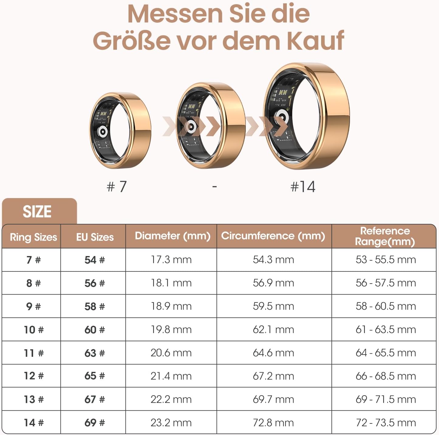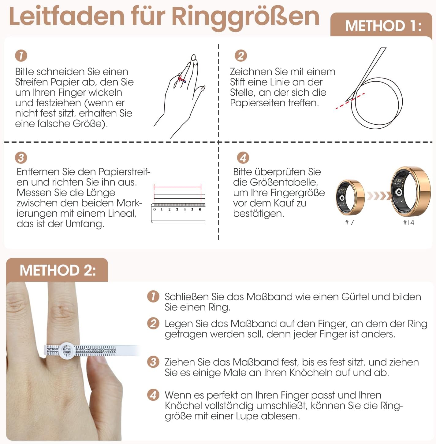 Bitte bestätigen Sie die Größe vor dem Kauf: Bevor Sie einen intelligenten Ring kaufen, bestätigen Sie bitte Ihre Fingergröße gemäß der im Bild angegebenen Messmethode. Es wird empfohlen, die Messung am Nachmittag oder Abend zu messen, wenn Ihre Finger leicht geschwollen sind, so dass die Größe genauer ist. Nachdem Sie die Größe bestätigt haben, können Sie unseren Fitness -Ring -Tracker auswählen.