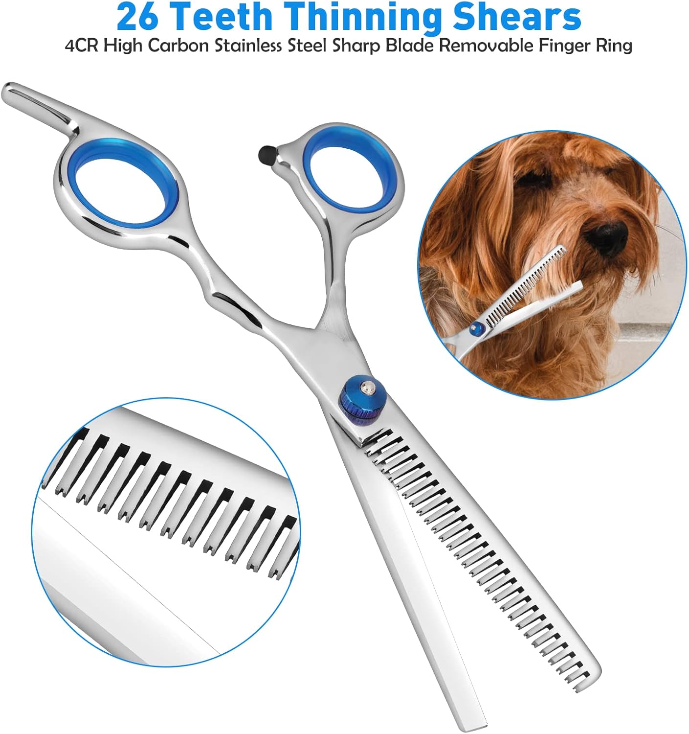 Premium -Material: Alle Scheren bestehen aus dauerhaftem Edelstahl, Titanbeschichtung und kaltem Behandlung für Härte, Haltbarkeit und Stil. Die Schere der Schere ist sehr glatt, scharf und langlebig, ohne zu rosten. Dieser Prozess verringert die Reibung, um Haustierhaare luftig zu scheren.