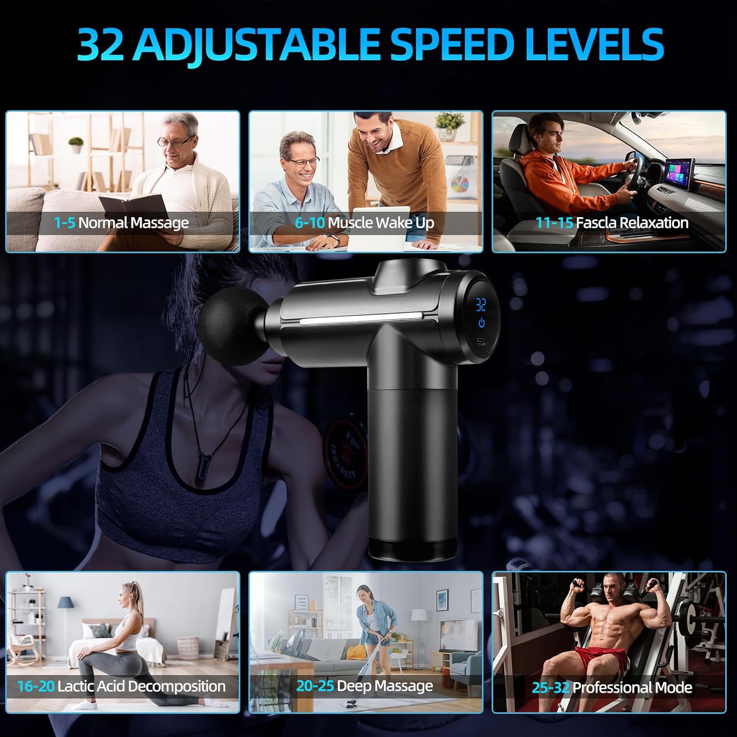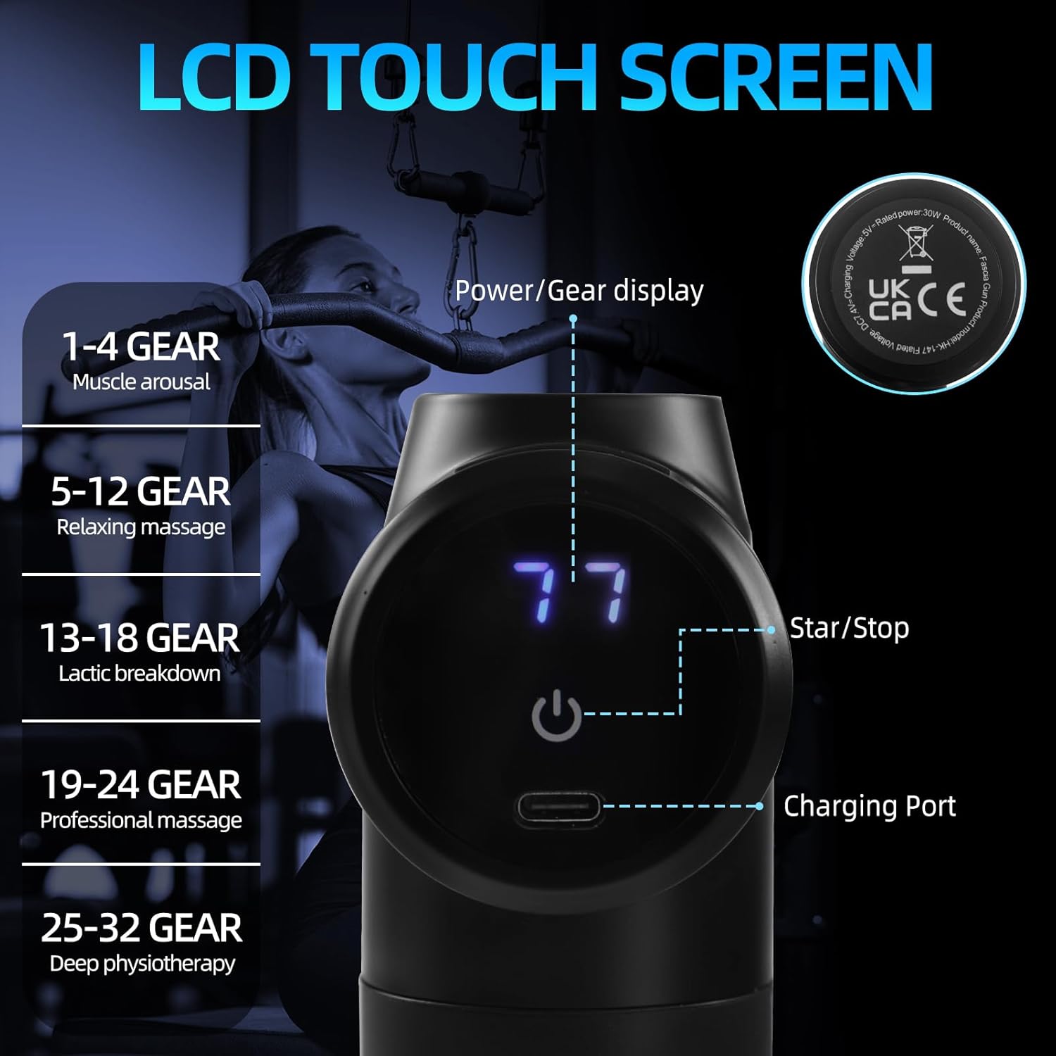 32 Geschwindigkeitspegel und taktiler LCD-Bildschirm mit 32 einstellbaren Geschwindigkeitseinstellungen (1800-3200 Schläge/Minute) können Sie die Geschwindigkeitsquelle gemäß dem Niveau Ihrer beiden Muskeln importieren. Zu diesem Zeitpunkt zeigt unser Percussion -Massagegerät mit einem taktilen LCD -Bildschirm die Geschwindigkeit und den Leistungsniveau.